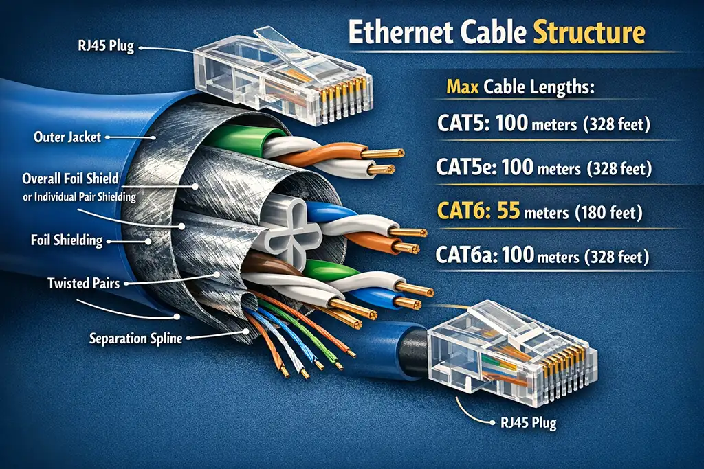 The maximum cable length is 100 meters (328 feet) for CAT5 and CAT5e. For CAT6, the maximum length is 55 meters (180 feet) when operating at 10 Gbps, while for 1 Gbps it can reach up to 100 meters. CAT6a supports 10 Gbps over a distance of 100 meters (328 feet). Depending on cable quality, these cables may also operate over longer distances, but the listed values represent the basic specifications.