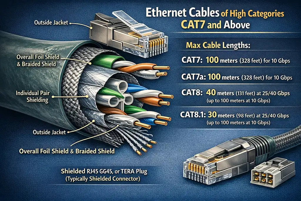 Maximum supported cable length. CAT7 and CAT7a support data transfer rates of up to 10 Gbps over a standard Ethernet distance of 100 meters. CAT8 cables are primarily designed for data centers and support speeds of 25 or 40 Gbps over shorter distances, typically up to 30-40 meters, while maintaining the ability to transmit data at 10 Gbps over longer distances.