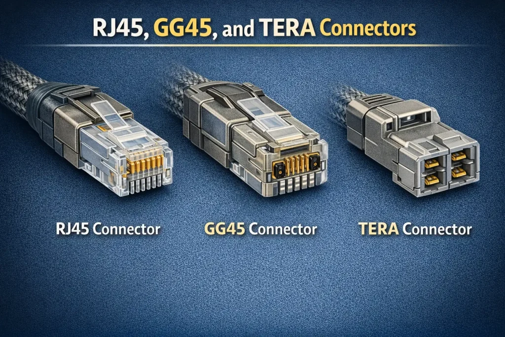 Shielded connectors must be used with cables in this category. Depending on the standard and application, this can be a shielded RJ45, GG45, or TERA connector. At these frequencies, continuity of shielding between the cable and connector is very important, so unshielded connectors should not be used.